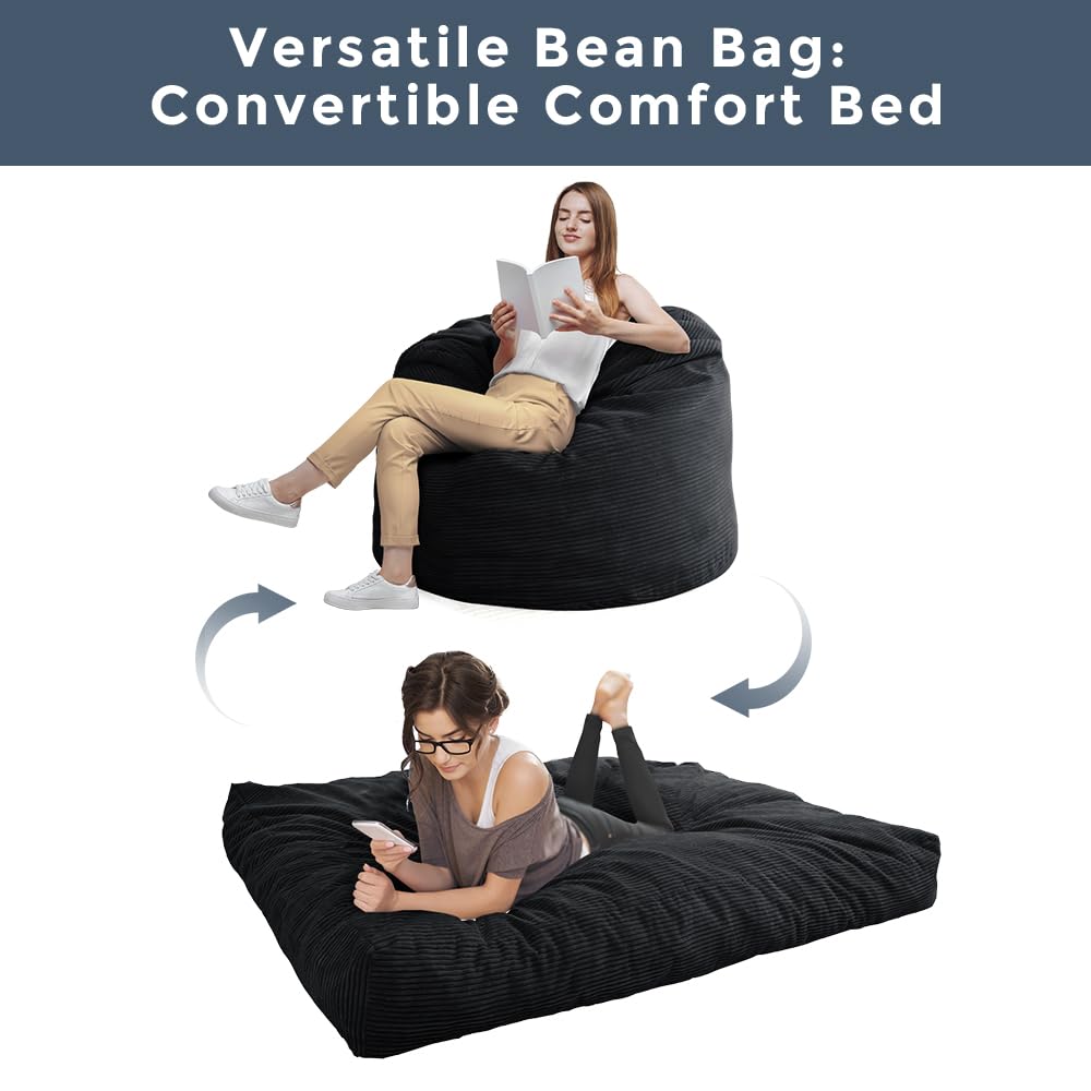 MAXYOYO Bean Bag Bed - Convertible Folds from Bed To Bean Bag Chair - Large Bean Bag with Soft Cover (Black)