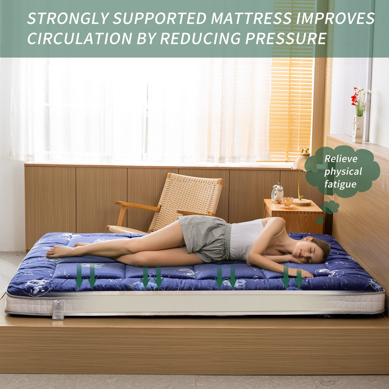 The futon mattress can be used as Bedroom Futon/Living Room Futon/Tatami Mat/Floor Mattress/Sleeping Floor mat/Tent Mat/Guest Mattress/Japanese Bed Mat/Carpet, and also can be a kid's play mat/floor pillow bed, also you can put it in your car and take it anywhere, It is a great choice for your small space, and it is a good accompany for your family.